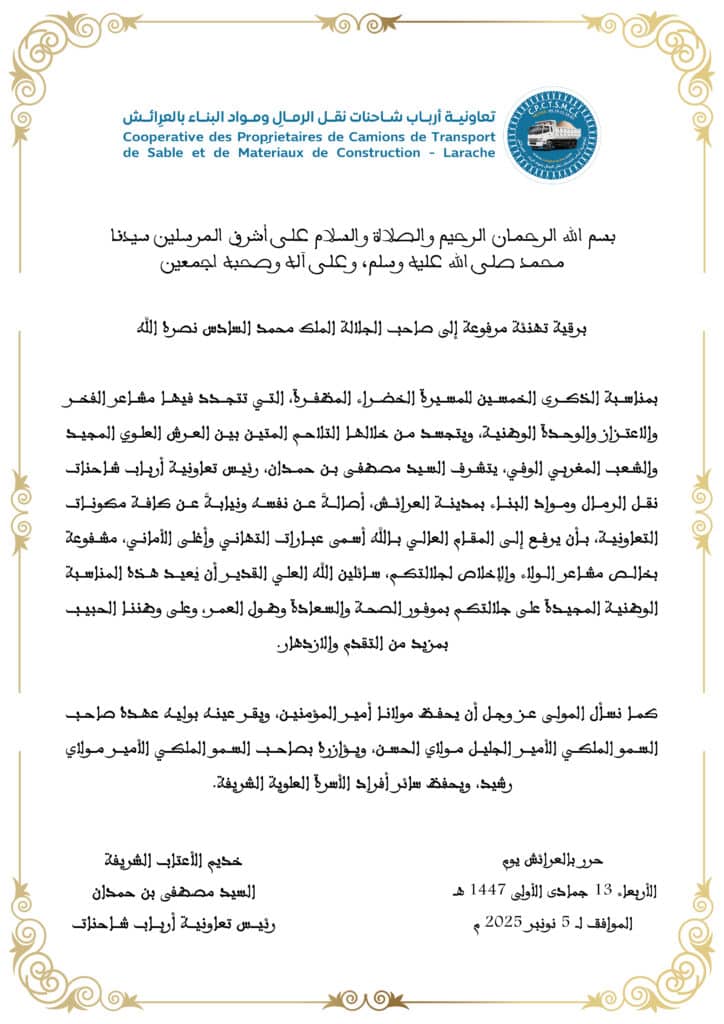 بمناسبة الذكرى الخمسين للمسيرة الخضراء المظفرة، بعث السيد مصطفى بن حمدان، رئيس تعاونية أرباب شاحنات نقل الرمال ومواد البناء بمدينة العرائش، أصالةً عن نفسه ونيابةً عن كافة مكونات التعاونية، برقية تهنئة إلى صاحب الجلالة الملك محمد السادس نصره الله.